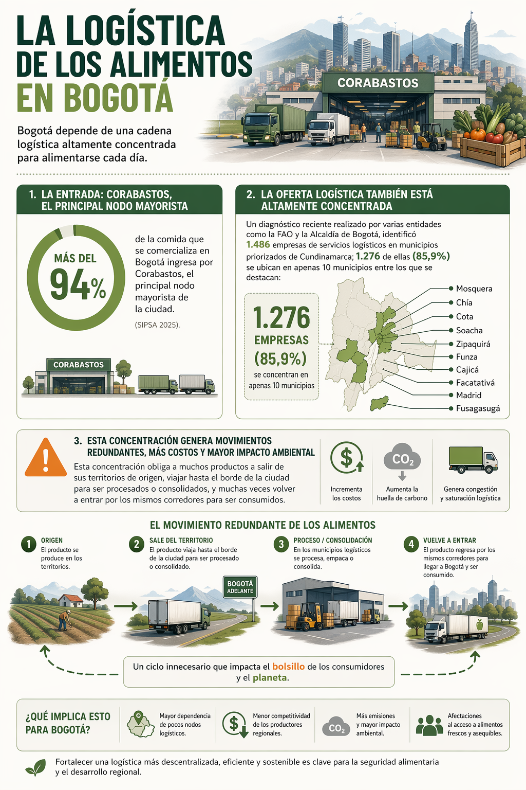 Esta concentración no solo ocurre en el punto de llegada, sino también en la oferta de servicios logísticos. Un diagnóstico reciente realizado por la varias entidades como la FAO y la Alcaldía de Bogotá, identificó 1.486 empresas de servicios logísticos en municipios priorizados de Cundinamarca; 1.276 de ellas (85,9%) se ubican en apenas 10 municipios entre los que se destacan Mosquera, Chía, Cota, Soacha, Zipaquirá, Funza, Cajicá, Facatativá, Madrid y Fusagasugá.