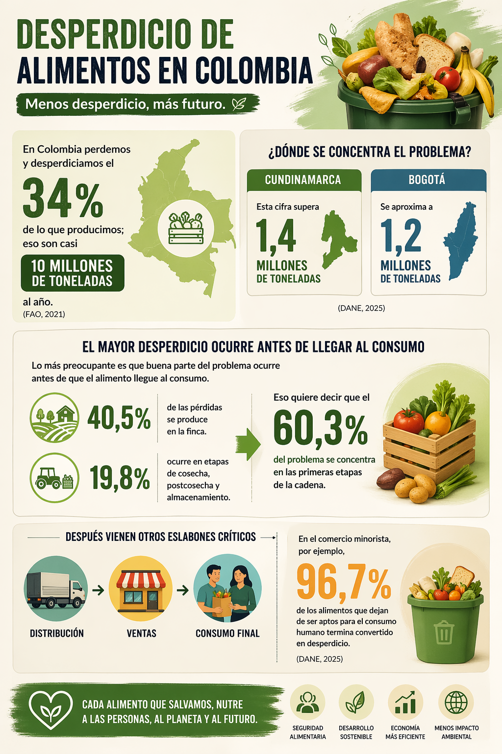 Una de las expresiones más duras de esta ineficiencia es la comida que nunca llega a la mesa. En Colombia perdemos y desperdiciamos el 34% de lo que producimos; eso son casi 10 millones de toneladas al año (FAO, 2021).