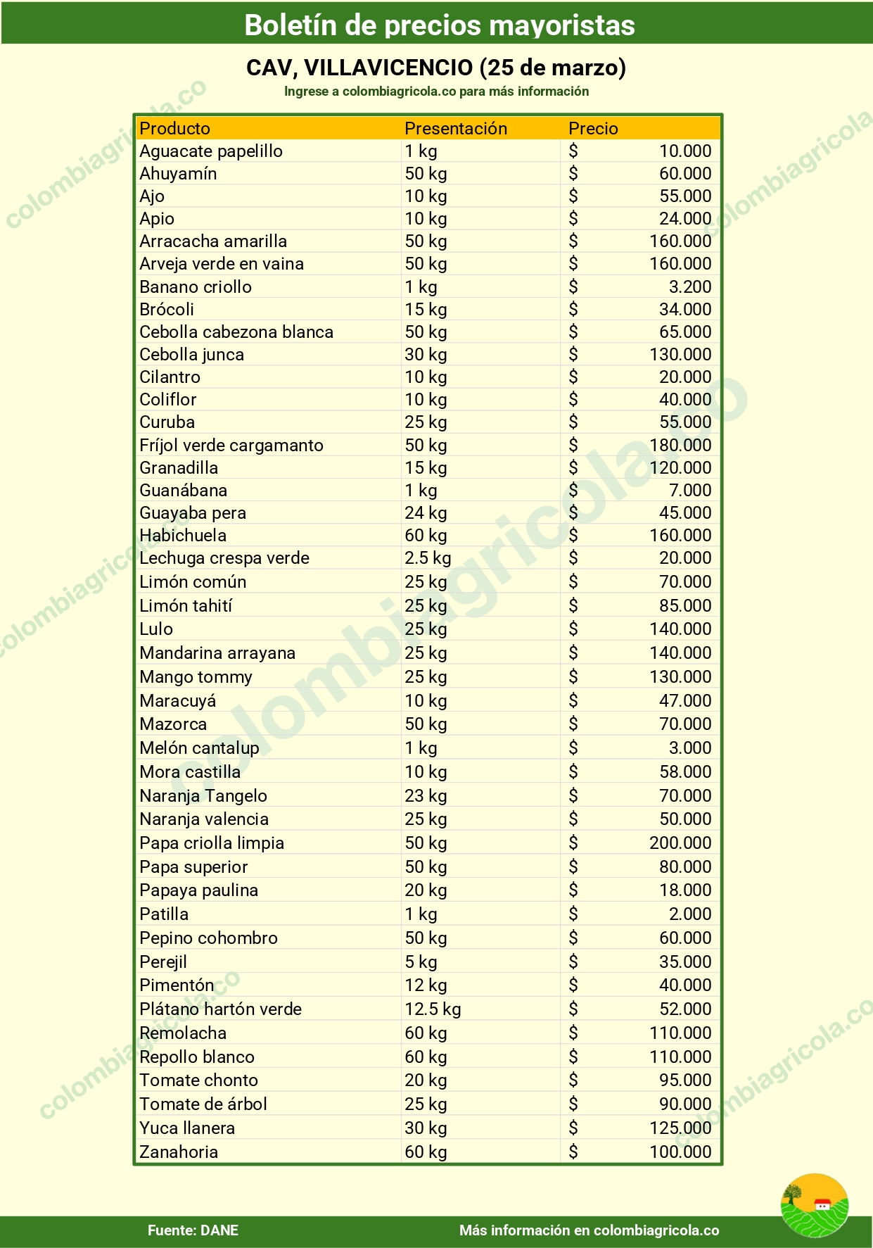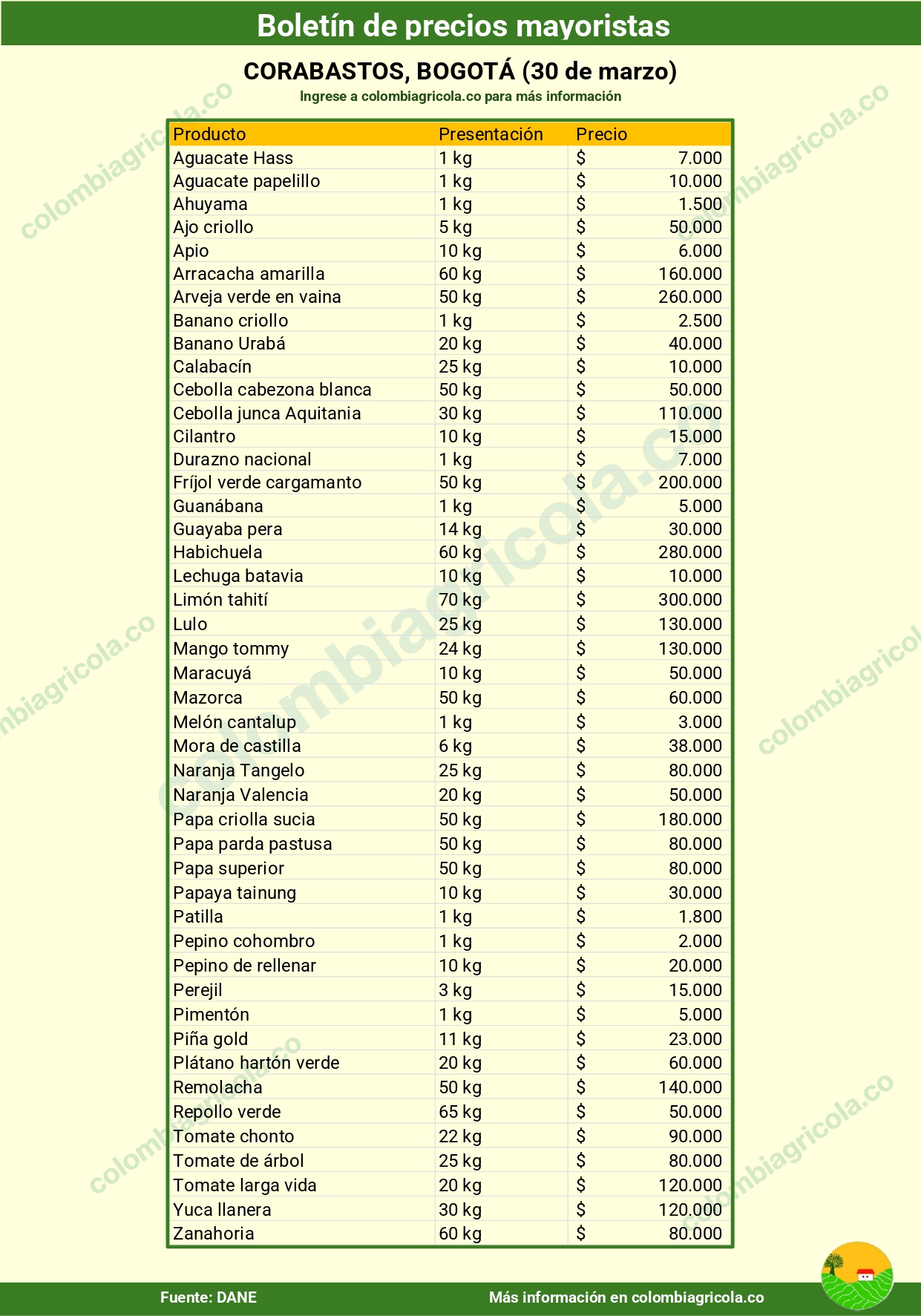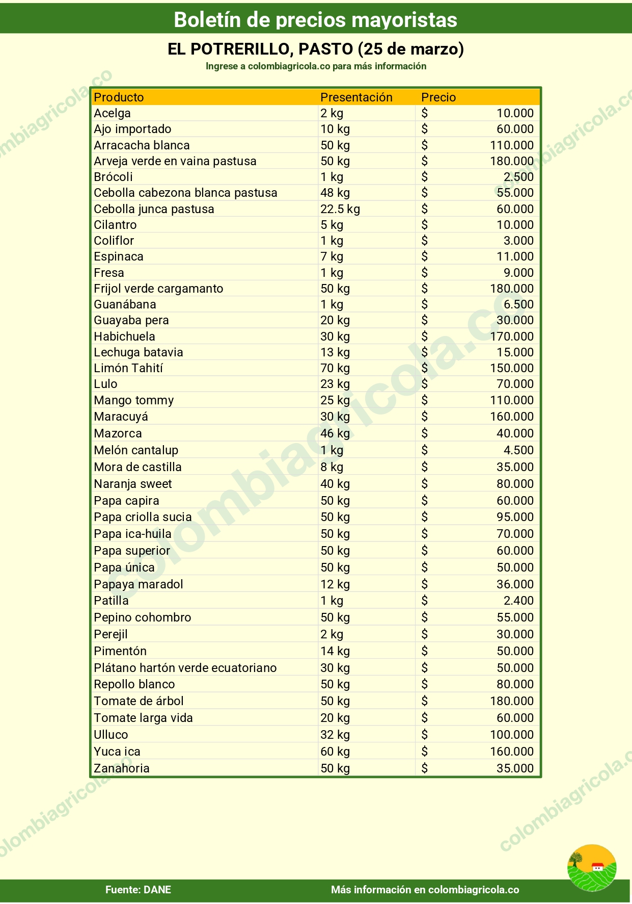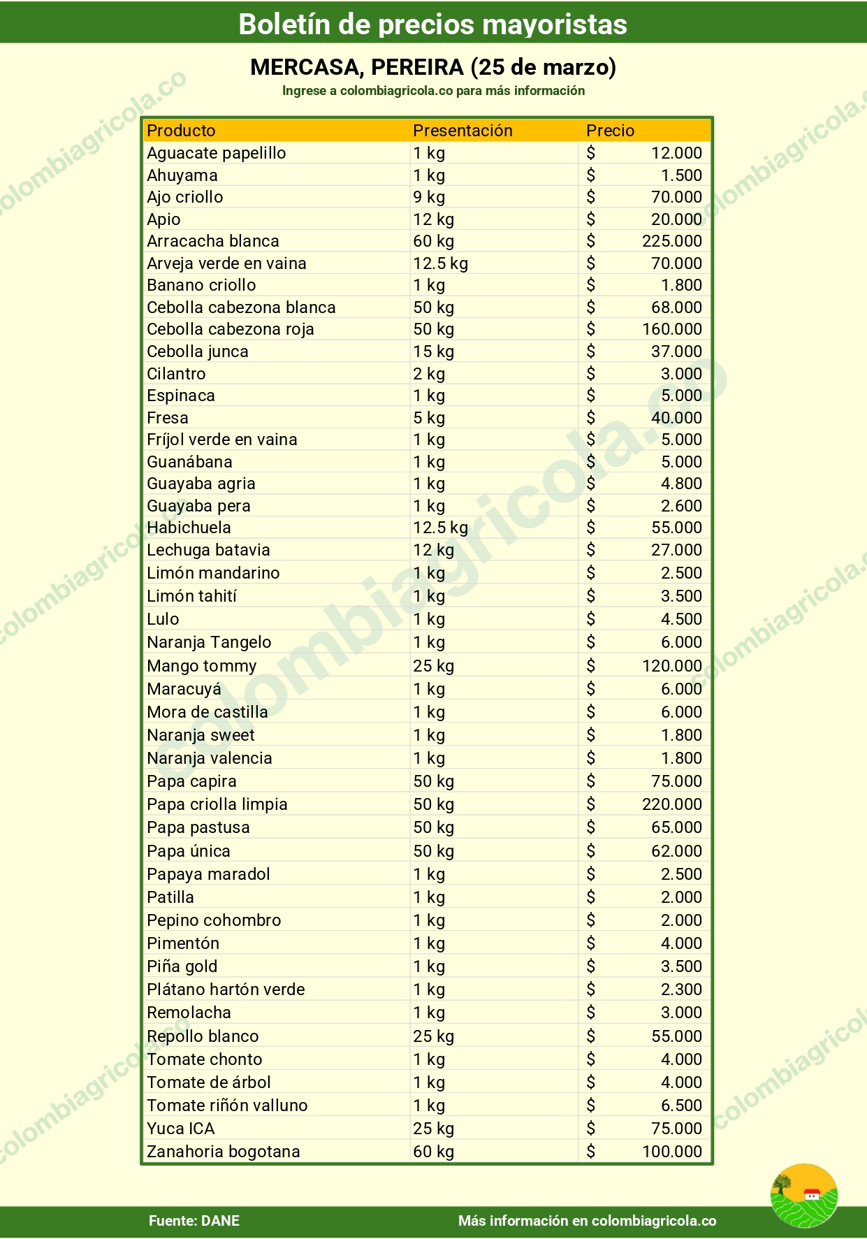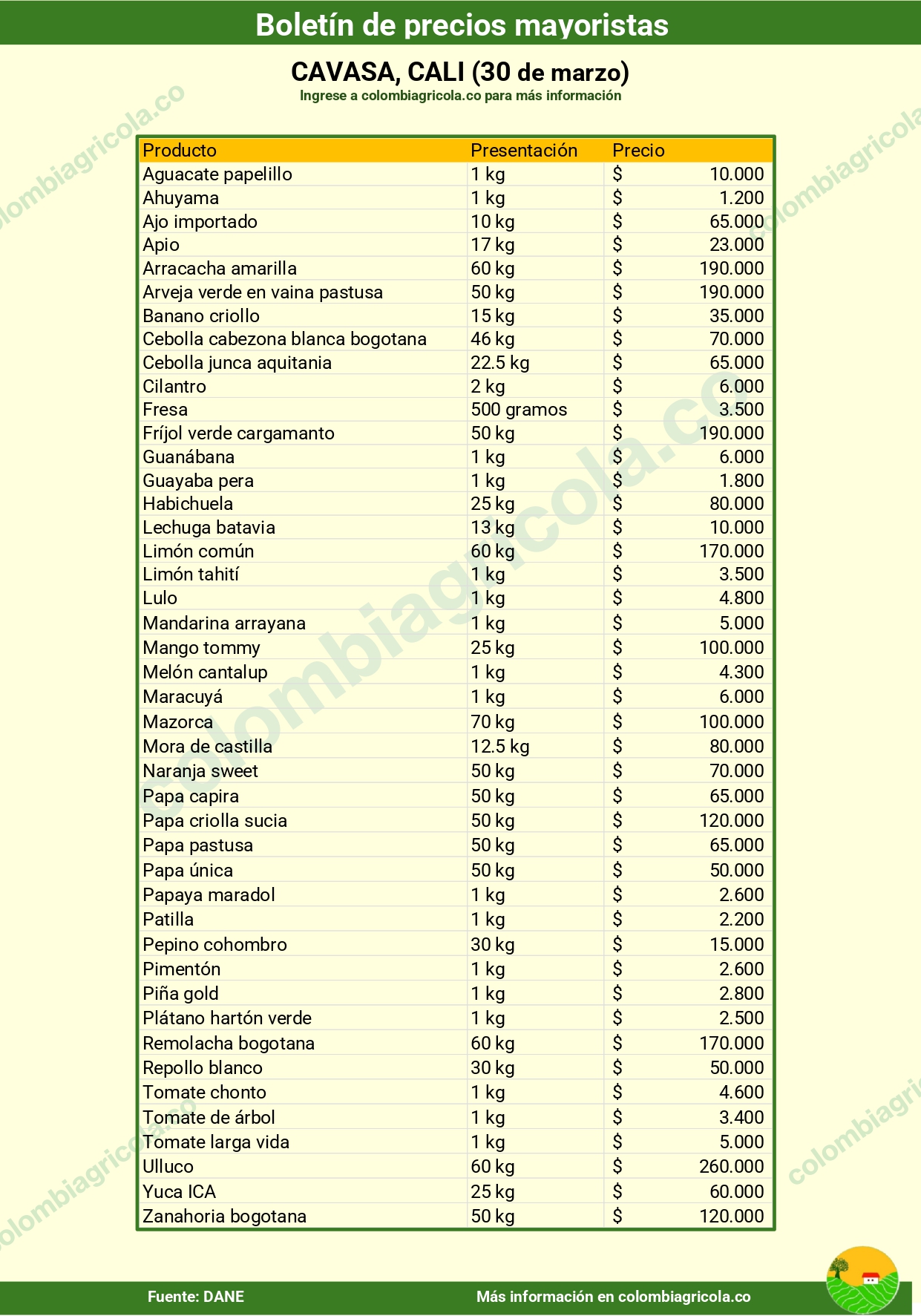 Lo que más baja: Brócoli, calabaza, papayas tainung y Paulina, guayaba pera, mango Tommy, habichuela, ciruela roja, melón Cantalup, pepino cohombro, repollo verde, limón Tahití, maracuyá, papas criolla sucia y limpia, gulupa, remolacha, coliflor y pepino de rellenar.