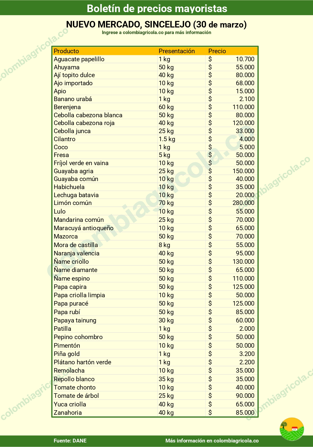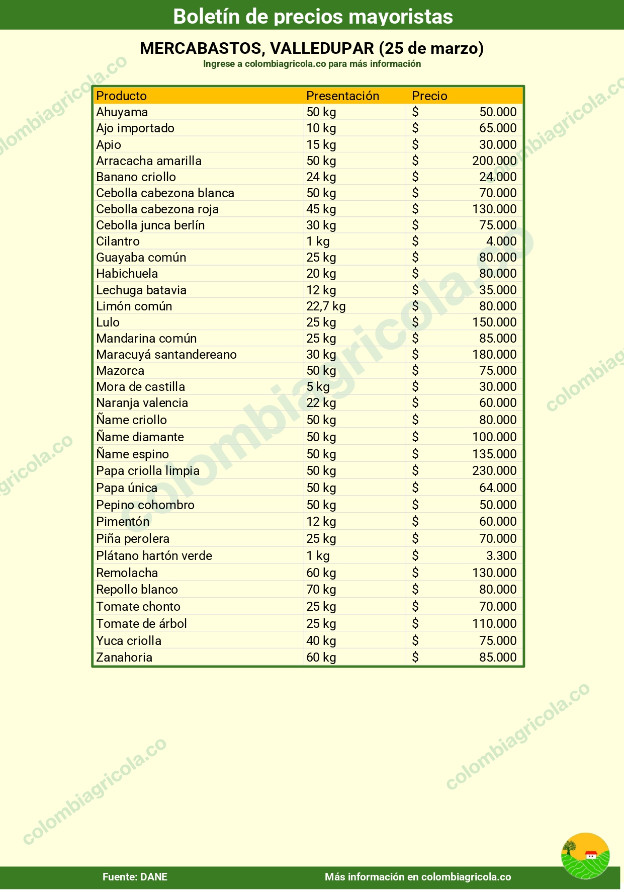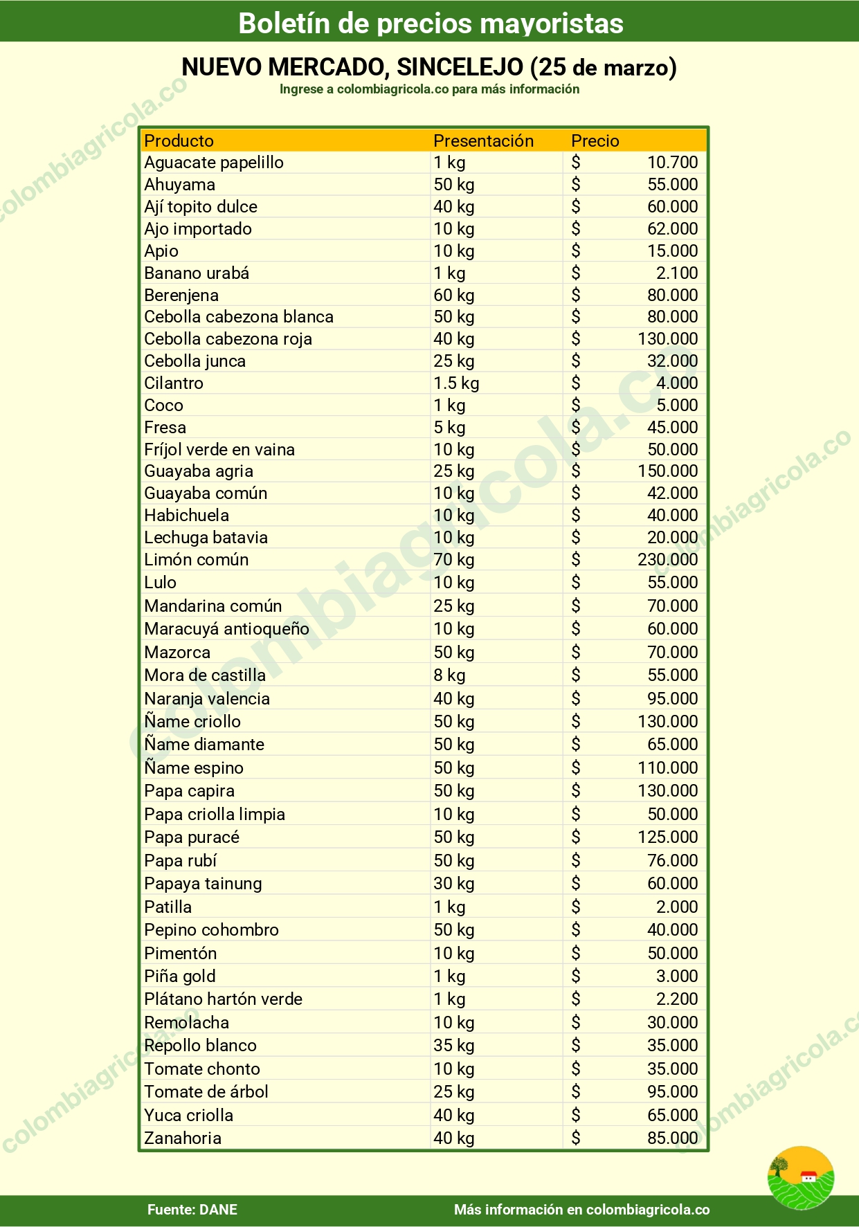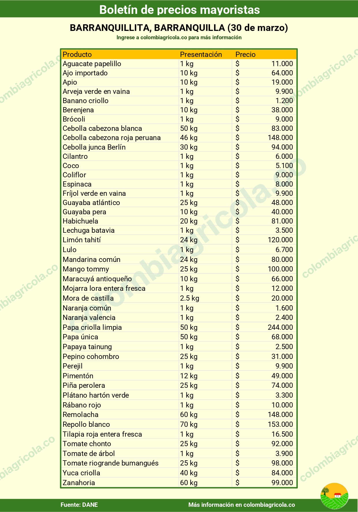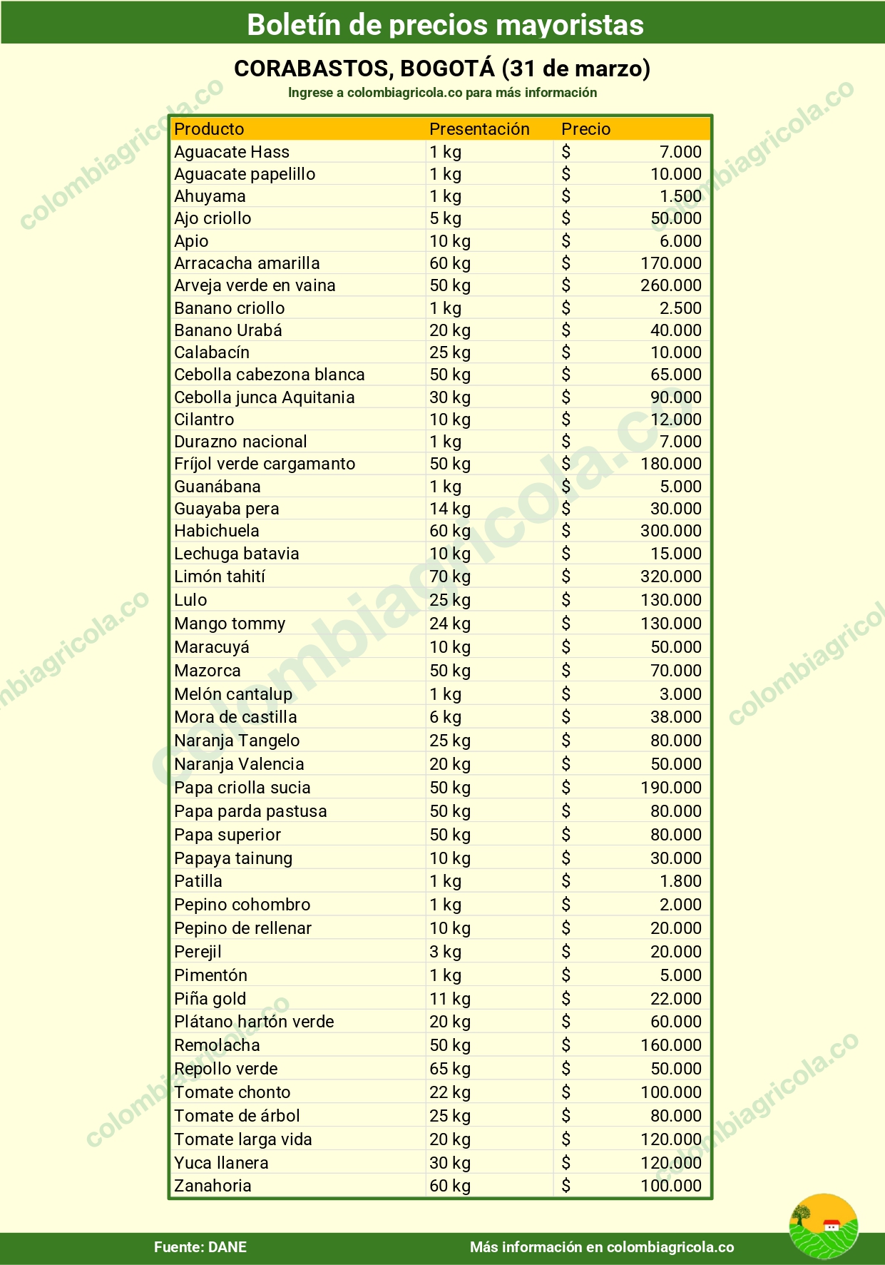 Lo que más baja: Brócoli, calabaza, papayas tainung y Paulina, guayaba pera, mango Tommy, habichuela, ciruela roja, melón Cantalup, pepino cohombro, repollo verde, limón Tahití, maracuyá, papas criolla sucia y limpia, gulupa, remolacha, coliflor y pepino de rellenar.
